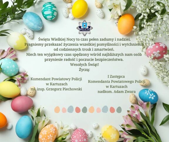 Życzenia Komendanta Powiatowego Policji w Kartuzach z okazji Świąt Wielkiej Nocy Data publikacji: 02.04.2026 Komenda Powiatowa Policji w Kartuzach