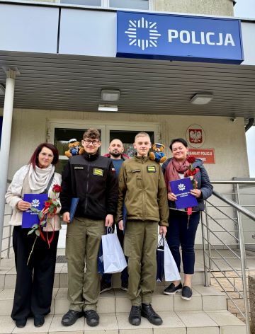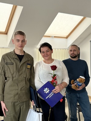 Dziś w Komisariacie Policji w Żukowie odbyło się wyjątkowe spotkanie. Komendant Powiatowy Policji w Kartuzach mł.insp. Grzegorz Piechowski spotkał się z Maciejem Kwidzińskim i Jakubem Michalkiewiczem- dwoma uczniami Zespołu Szkół Zawodowych i Ogólnokształcących w Żukowie, którzy 8 października pomogli kartuskim kryminalnym w zatrzymaniu 19-latka, który na widok kryminalnych zaczął uciekać pieszo. Pościg ten był o tyle niebezpieczny, że mężczyzna wbiegał wprost pod jadące pojazdy i stwarzał ogromne zagrożenie dla siebie, ale i pozostałych uczestników ruchu drogowego. Dziś Komendant Powiatowy Policji w Kartuzach podziękował chłopcom za godną pochwały postawę obywatelską. Komendant podziękował również obecnym rodzicom chłopców, za trud włożony w ich wychowanie, który zaowocował wychowaniem dwóch młodych ludzi na porządnych i godnych naśladowania obywateli. W spotkaniu wziął również udział Komendant Komisariatu Policji w Żukowie podinsp. Zenon Halman, Pani Kierownik Rewiru Dzielnicowych kom. Aleksandra Drewa, przedstawiciele gminy Żukowo, na czele z Panią Burmistrz Mariolą Zmudzińską oraz Dyrektor Zespołu Szkół Zawodowych i Ogólnokształcących w Żukowie Gabriela Kowalska. Maciej i Jakub otrzymali podziękowania oraz upominki, które wręczył Komendant Powiatowy Policji w Kartuzach mł.insp. Grzegorz Piechowski oraz burmistrz Gminy Żukowo. Do podziękowań dołączył również Burmistrz Kartuz Mieczysław Grzegorz Gołuński, który przekazał chłopcom słynną maskotkę Kartuz- misia Bruno.