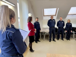 Następnie Komendant Powiatowy Policji w Kartuzach złożył gratulacje asp.sztab. Romualdowi Wierzbie, który 23 października zajął I miejsce w Turnieju Służby Dyżurnej jednostek województwa pomorskiego. Komendant złożył dyżurnemu gratulacje oraz życzył dalszego zadowolenia ze służby. Asp.sztab. Romuald Wierzba będzie reprezentował garnizon pomorski w ogólnopolskim turnieju, który odbędzie się od 19 do 21 listopada w Szkole Policji w Katowicach.