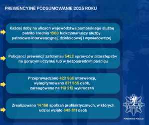 W minionym roku na ulicach województwa pomorskiego, każdej doby służbę pełniło średnio ponad 1500 funkcjonariuszy i funkcjonariuszek komórek patrolowo-interwencyjnych, dzielnicowych i wywiadowczych. Wspomniani policjanci pracowali na miejscu ponad 400 000 interwencji, wylegitymowali ponad 850 000 tysięcy osób, ujawnili i zareagowali na ponad 100 000 wykroczeń. Służba policjantów prewencji to nie tylko przeprowadzanie interwencji, to również działania profilaktyczne, które są ogromnie ważne w kontekście dbania o bezpieczeństwo. Dlatego też policyjni profilaktycy w 2025 roku przeprowadzili szereg działań skierowanych do osób z różnych grup wiekowych i środowiskowych, mających na celu zwiększenie świadomości i podniesienie bezpieczeństwa w naszym garnizonie. Policjanci zrealizowali ponad 14 000 spotkań profilaktycznych, w których uczestniczyło prawie 350 000 osób.